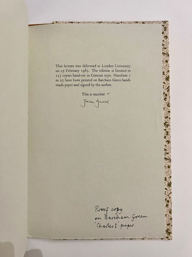 A few copies were printed on Barcham Green 'Charles I' paper, and sewn in patterned wrappers with printed paper label.