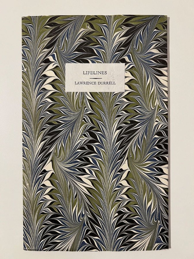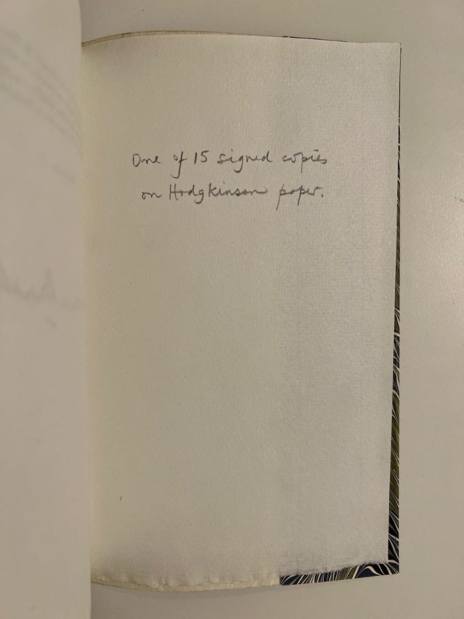 Printed on pale blue Hodgkinson hand-made paper, and sewn in Cockerell & Sons marbled wrappers with printed paper label.