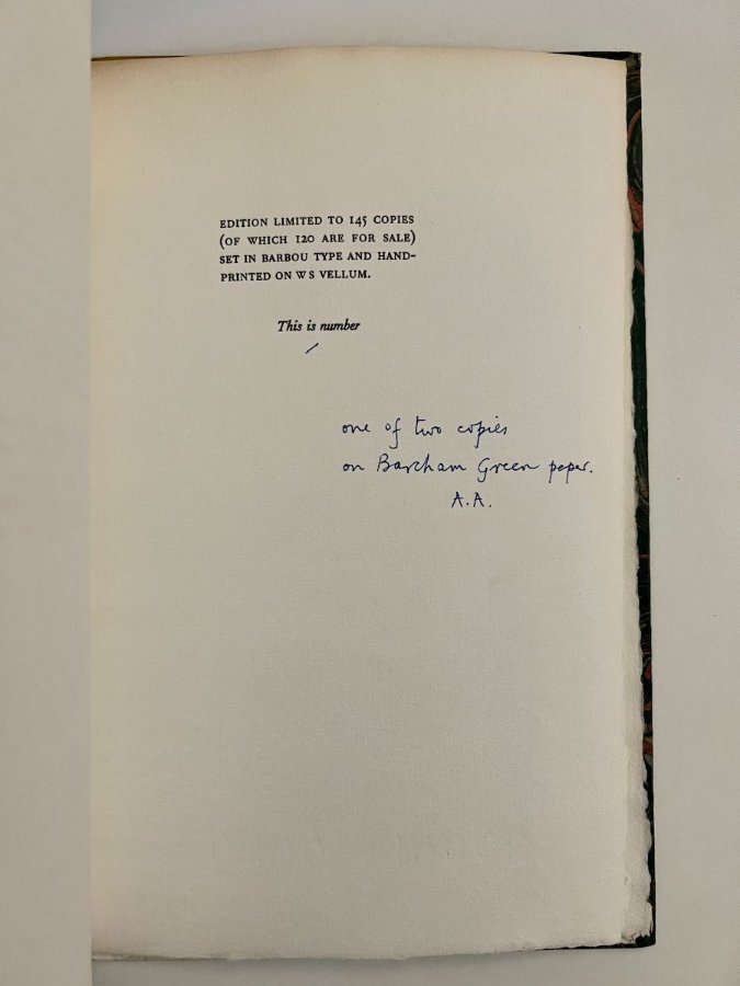Inscribed by the printer "one of two copies on Barcham Green paper. A.A.".