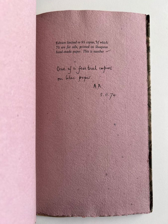 Inscribed by the printer "One of a few trial proof copies on lilac paper A.A. 5.11.74". The word "proof" is not present in all copies.