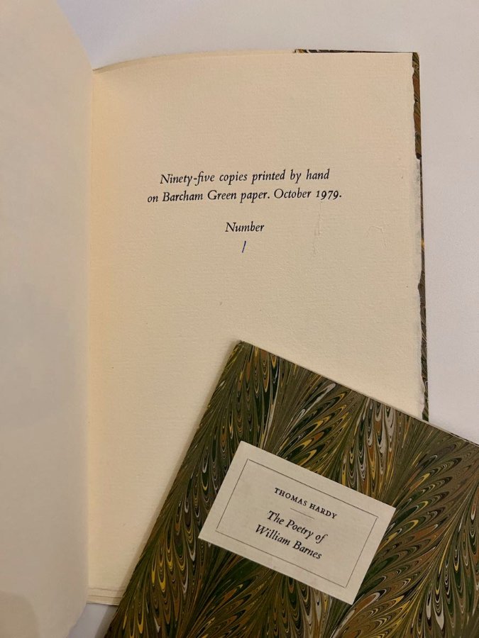 Printed on Barcham Green paper, and sewn in marbled wrappers with printed paper label.